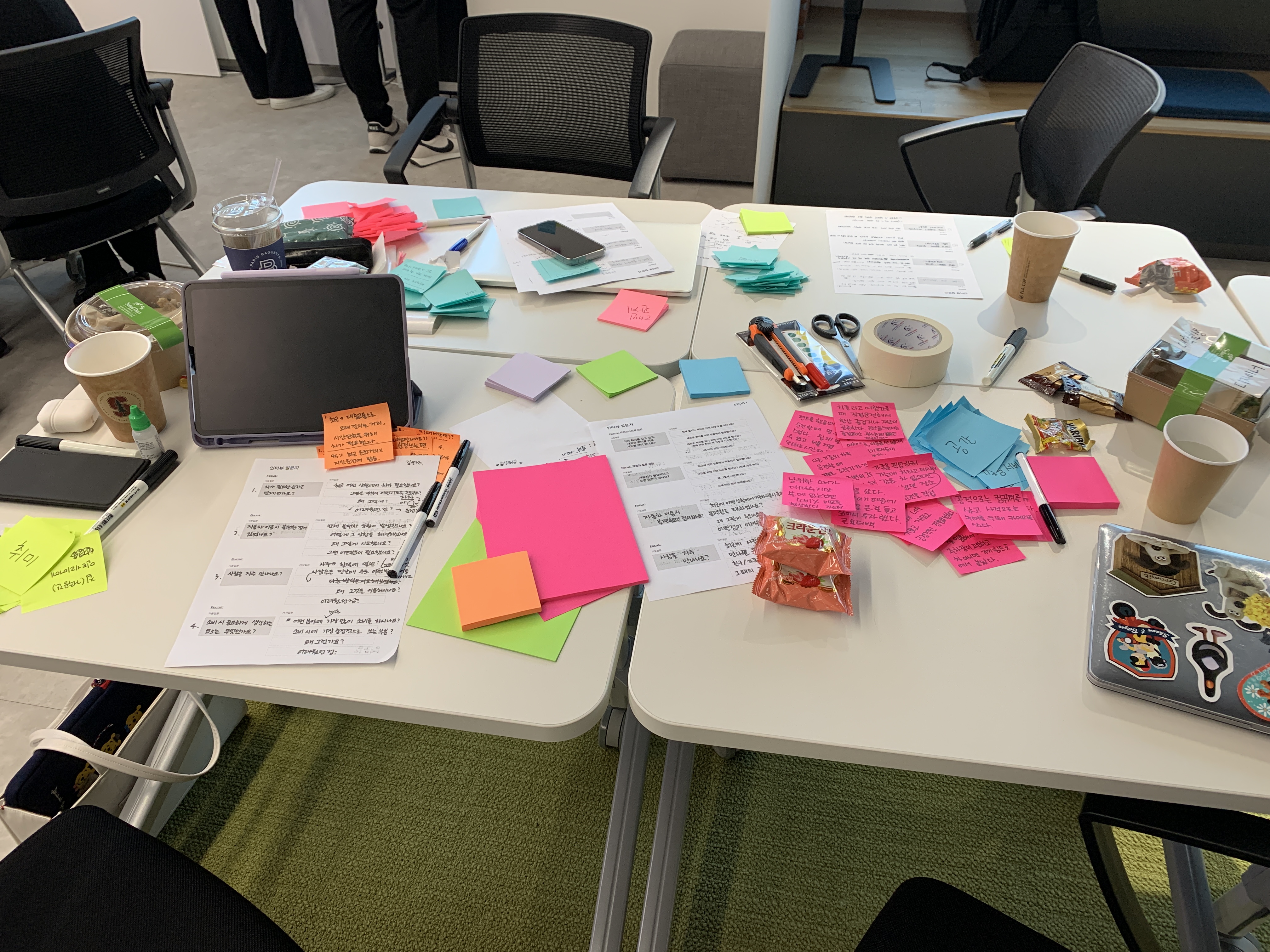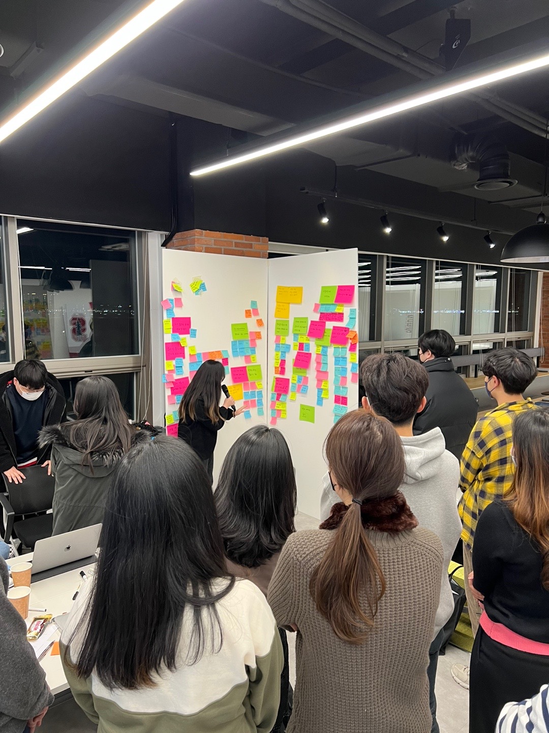 졸리게 만든다, 가림막, 소리를 들을 수 없는 환경, 각자 핸드폰 등 다양한 아이디어가 나오게 되었고 제한된 시간이 지나자 정 반대되는 아이디어들을 그룹핑을 하게되는데