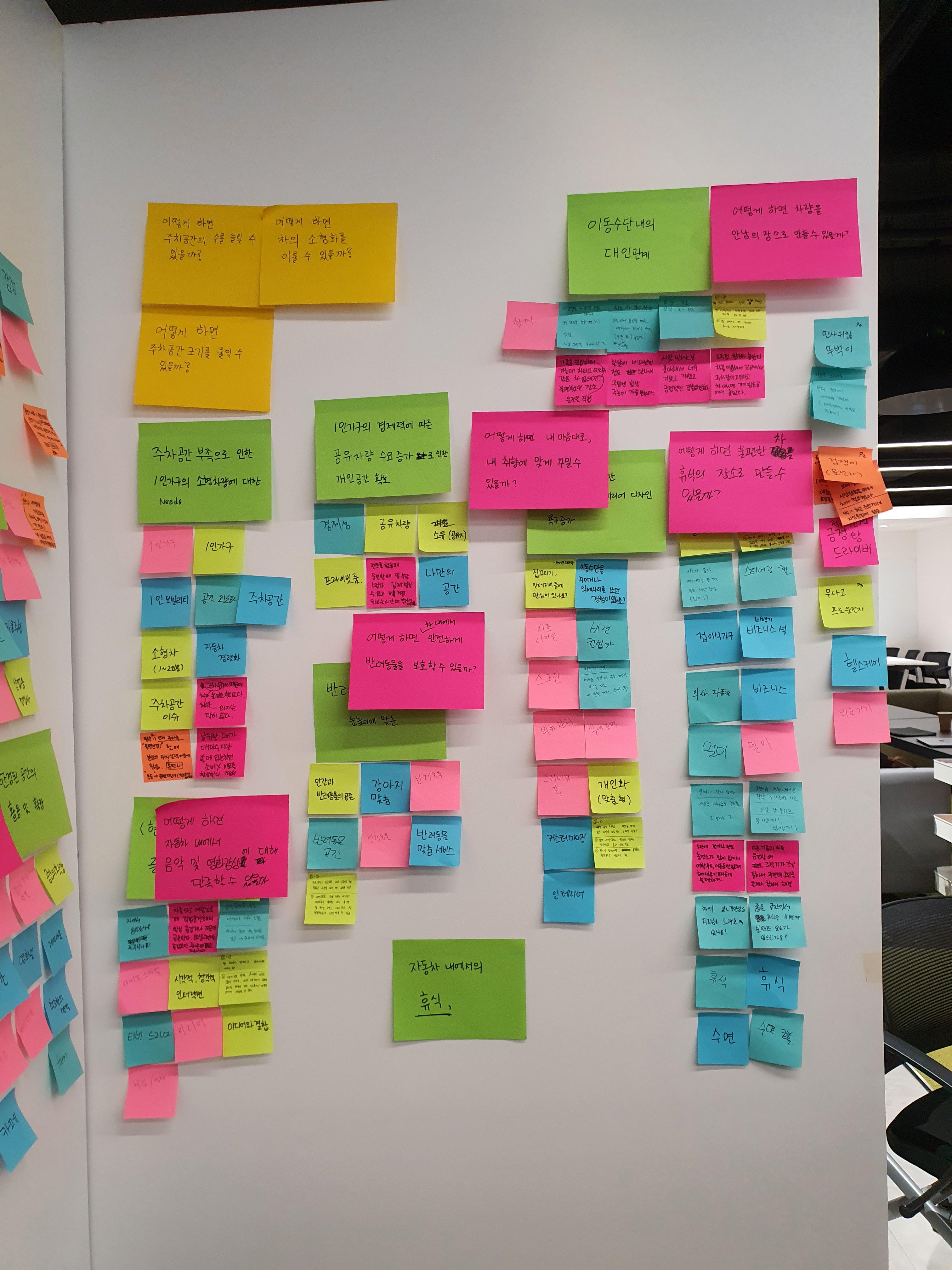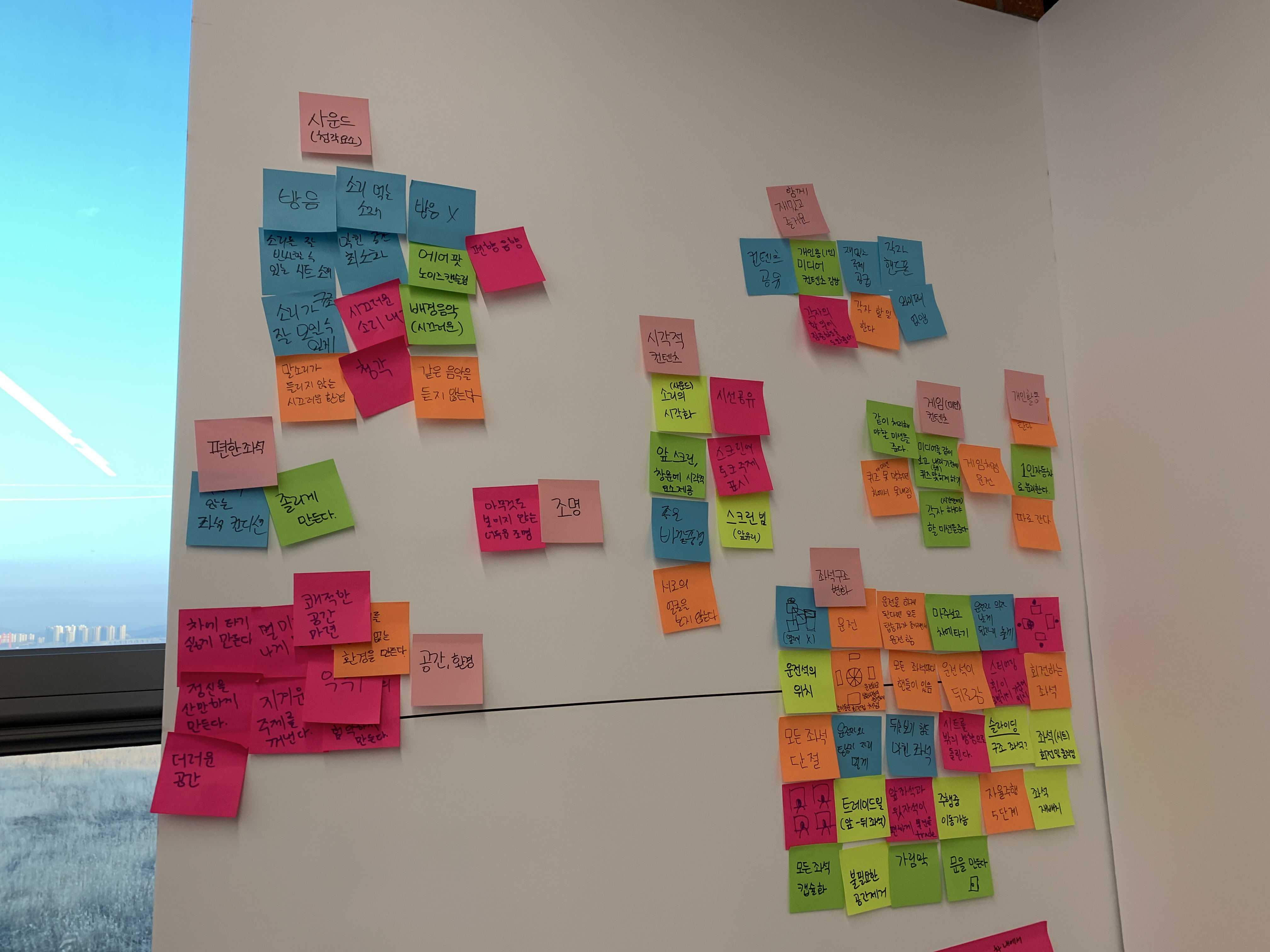 그 후 클러스터링을 시작하여 인터뷰 질문들과 단순한 키워드들을 한데 모아모아모아모아서 그룹핑을 했고 단순한 키워드로 그룹을 짓는게 아닌 문장으로 자세하게 그룹을 표현했다.