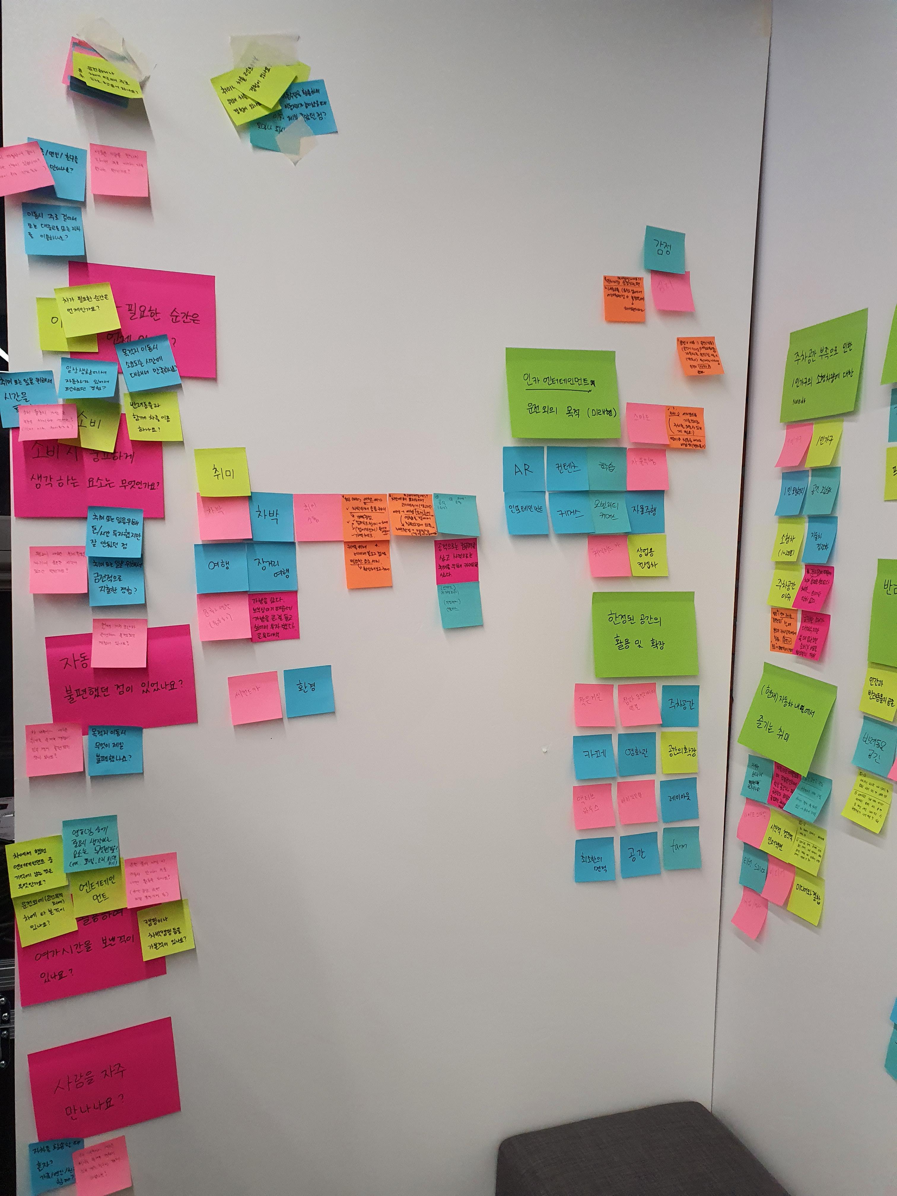 그래서 각자 원하는 아이디어를 적은 포스트잇을 가져와서 바로 밑에다 떠오르는 아이디어를 글로써 적어내었다. 오른쪽에 팀원들에게 설명해주면서 계단식으로 계속 넘겼다. 나중에는 그림으로 표현해서 오른쪽 팀원에게 계속 설명해주고 계속 넘기고 넘기고 했다.