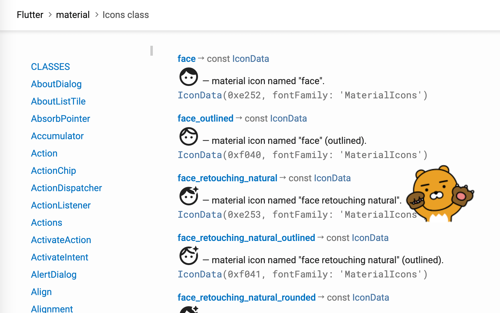 설치 한 후 플러그인 탭에서 [material design icons]를 선택하면 이렇게 아이콘을 적용 할 수 있는 창이 뜬다. 그리고 개발자에게 Flutter에서 머티리얼 아이콘 클래스 네임을 볼 수 있는 링크를 받는다.